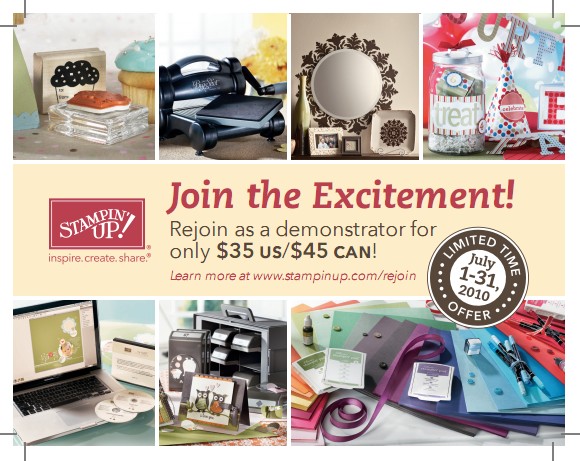 During the month of July, any former Stampin’ Up! demonstrator (who resigned on or prior to March 31, 2010) can rejoin Stampin’ Up! for only $35!