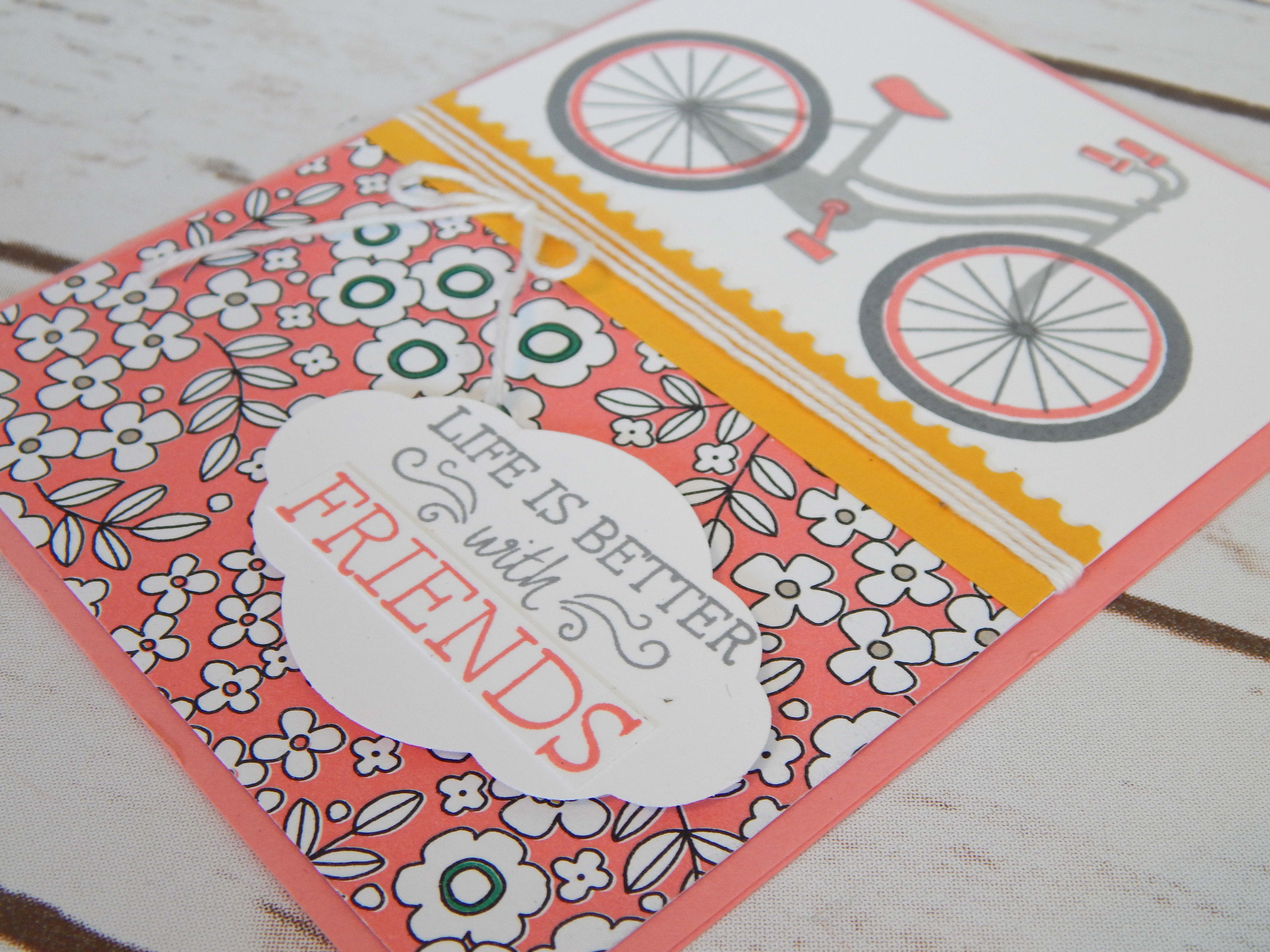 How cute it this new stamp set called BIKE RIDE? I made this when I was in Wyoming visiting my friend Barb. We had a blast creating a bunch of cards with preorder items from the new catalog. I didn't have the matching BUILD A BIKE FRAMELITS when I made this one or I would have put the cute little basket die cut on it…but it's still adorable – don't you think?