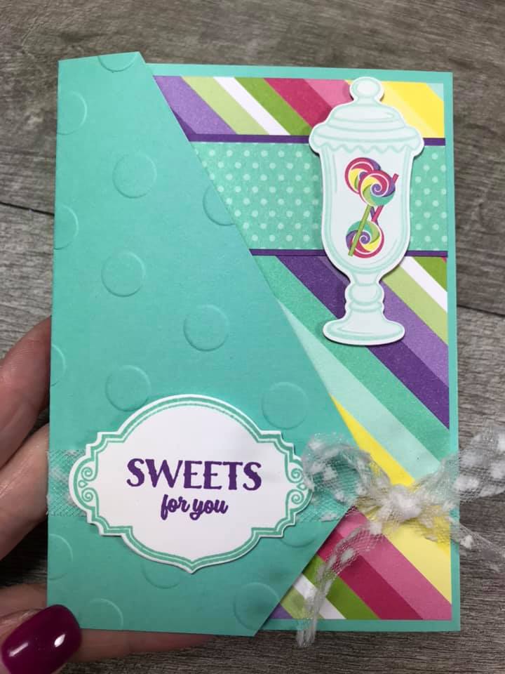 These candy cards look almost good enough to eat don't they? I love this bundle called Sweetest Thing and this tri-fold card really shows off the designer series paper called How Sweet It Is – all are retiring including the Quilt Top embossing folder.