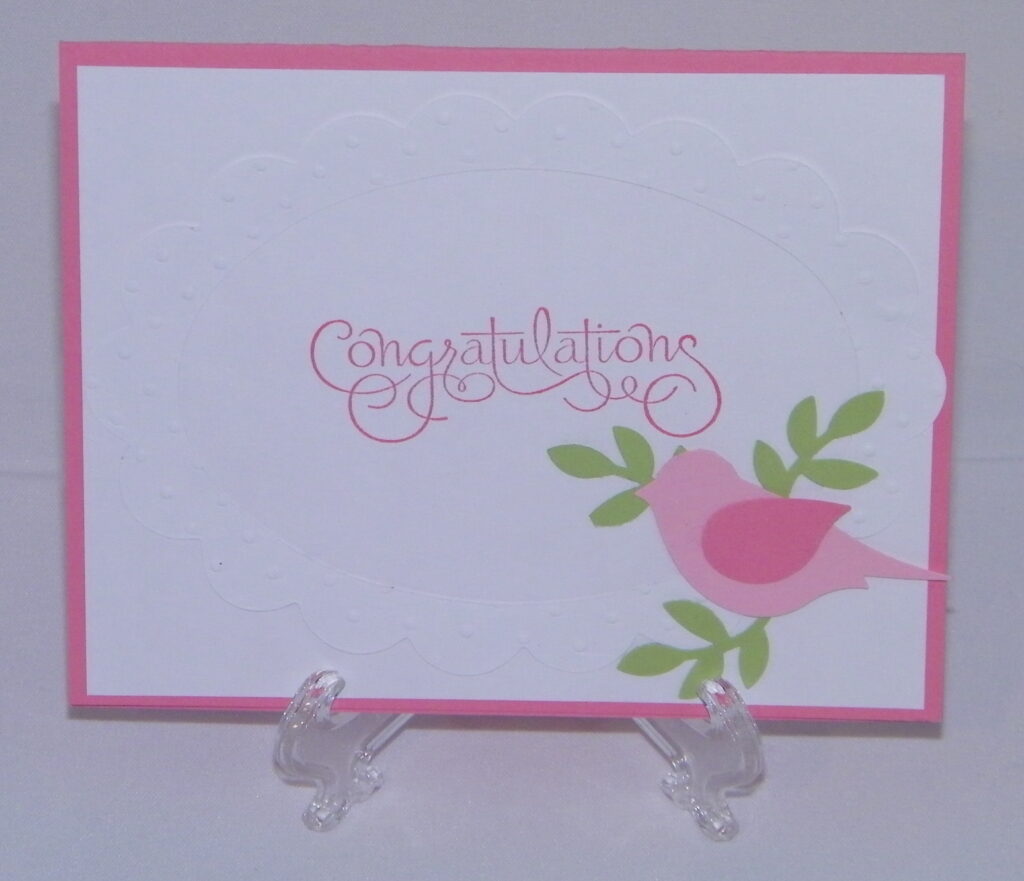 3. Stamp Congratulations in the middle of your card and adhere the scalloped frame;